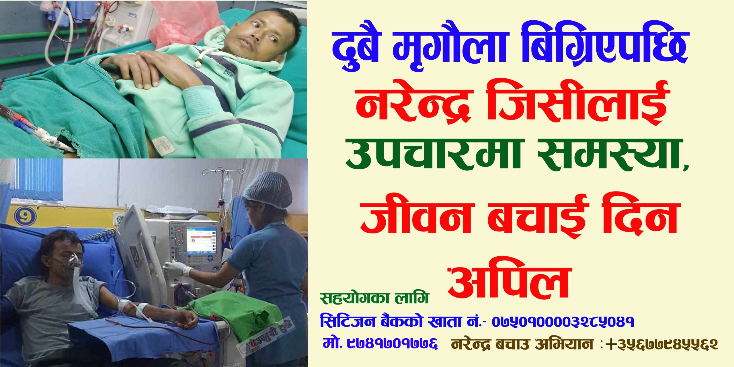दाङ । प्युठान जिल्लाको झिमरुक गाउँपालिका वडा नम्बर ७ तुषारा काप्रेखोला निवासी ३५ बर्षका नरेन्द्रबहादुर जिसी लाउलाउ खाउ खाउकै उमेरमा आफ्नो दुबै मिगौला बिग्रिएपछि आफ्नो जीवन बचाईदिन सबैसँग अनुरोध गरेका छन् ।