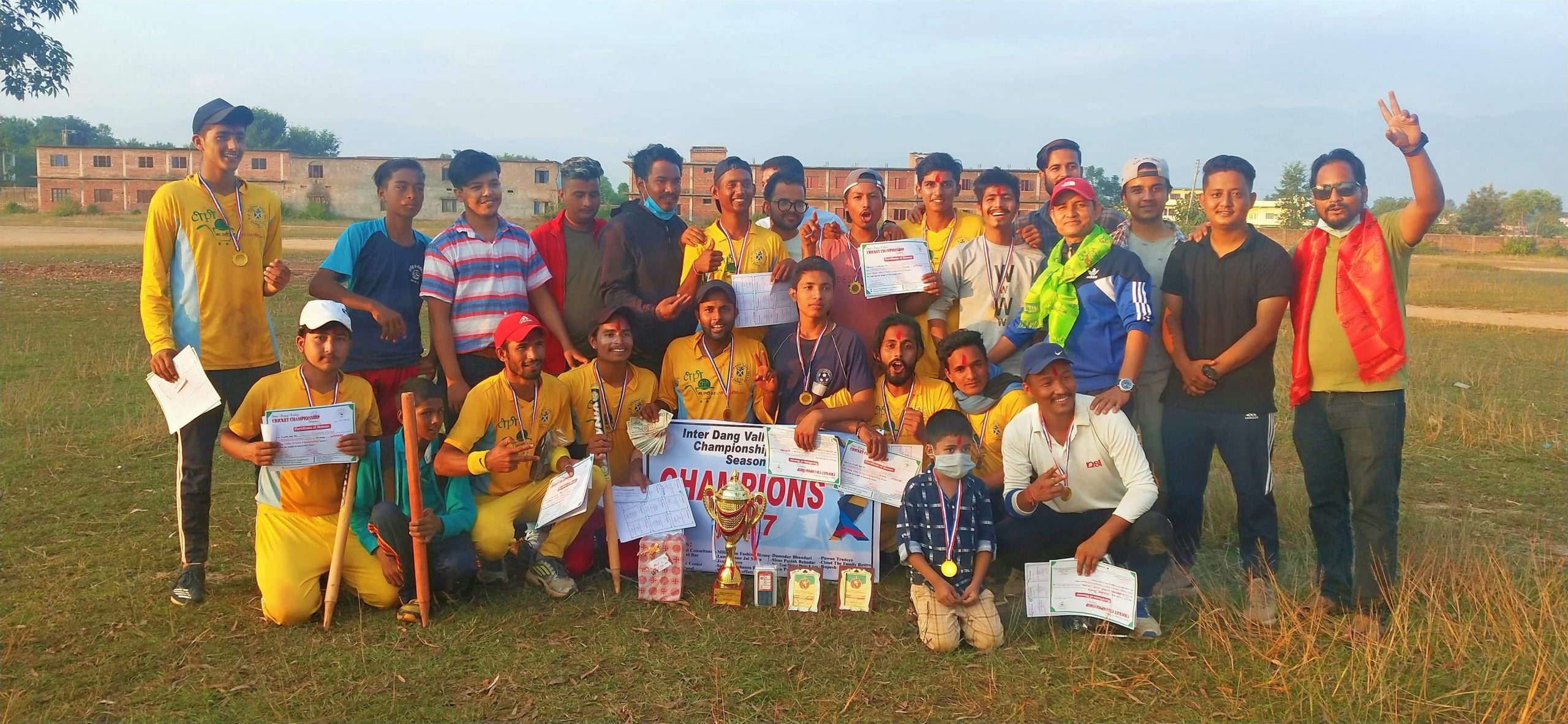 दाङ । ईन्टर दाङ टि–२० क्रिकेट २०७७ को उपाधि त्रिसिद्धेश्वरी स्पोर्ट्स क्लब तुलसीपुरले हात पारेको छ । महेन्द्र माविको खेल मैदान तुलसीपुरमा भएको फाईनल खेलमा ज्ञान ज्योती स्पोर्ट्स एकाडेमी तुलसीपुरलाई ८ रनले पछि पार्दै त्रिसिद्धेश्वरी स्पोर्ट्स क्लबले उपाधि हात पारेको हो । उपाधिसंगै उसले नगद २५ हजार, ट्रफी, मेडल तथा प्रमाणपत्र हात पारेको प्रतियोगिताका संयोजक आभाष बुढाथोकीले जानकारी दिनुभयो ।