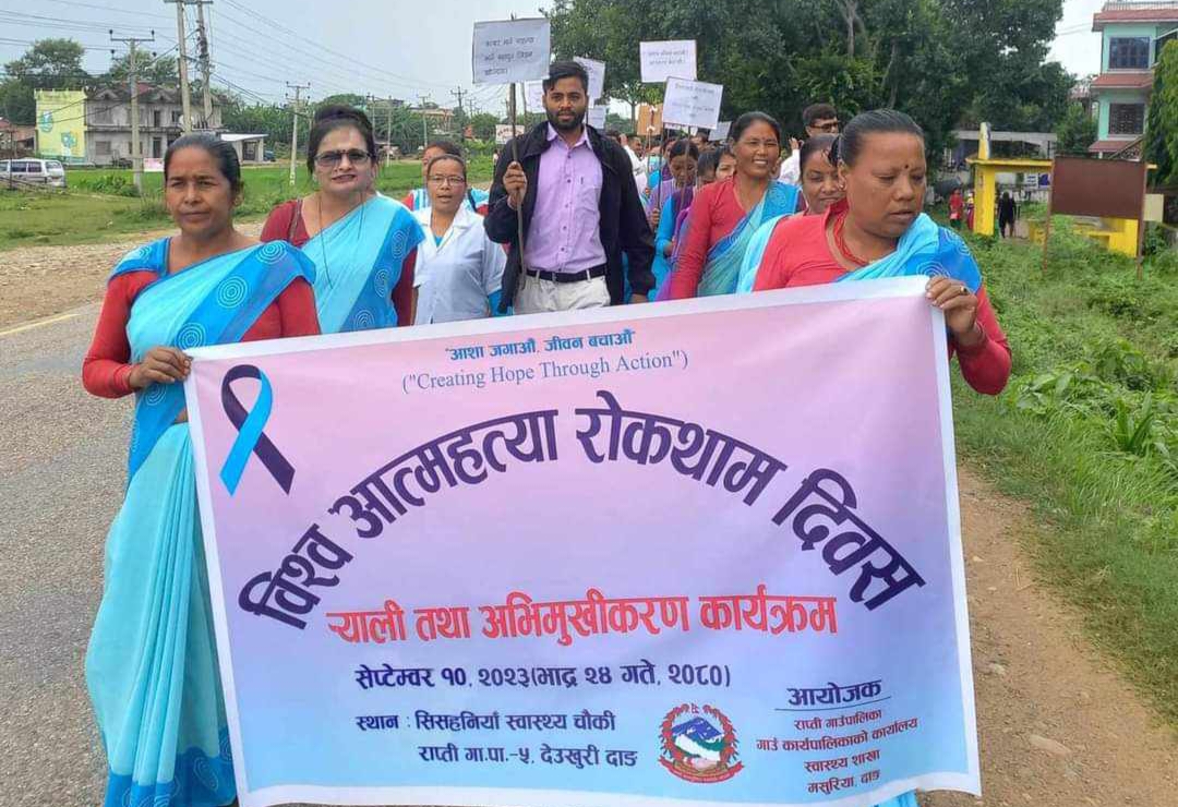 ‘आशा जगाऔँ, जीवन बचाऔँ’ भन्ने मुल नाराका साथ दिवसको अवसर पारेर सचेतनामुलक र्याली निकालिएको हो । राप्ती गाउँपालिका स्वास्थ्य शाखाको आयोजनामा निकालिएको सचेतनामुलक र्यालीले सिसहनियाँ बजार परिक्रममा गरिएको हो । जीवन अमूल्य छ, सामाजिक जीवन जिऔँ, अति महत्त्वाकाङ्क्षा त्यागौँ, प्ले कार्ड सहित बजार परिक्रममा गरिएको थियो । र्याली पछि सिसहनियाँ स्वास्थ्य चाैकीमा आयोजित अभिमुखिकरण कार्यक्रममा स्वास्थ्य शाखा प्रमुख नारायण राउतले पारिवारिक र सामाजिक जीवनशैली अपनाउन सके आत्महत्या न्यूनीकरण हुँदै जाने बताउनु भयो ।