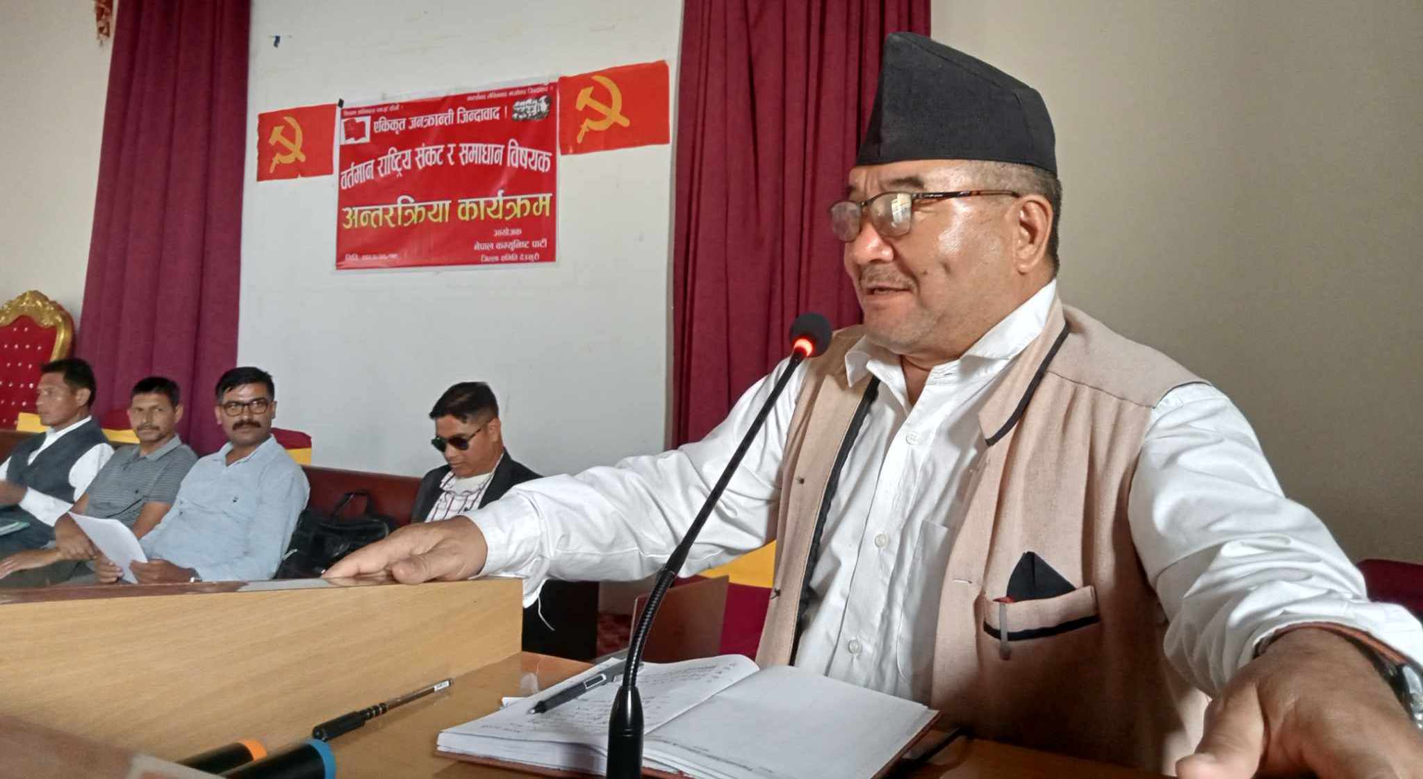 नेपाल कम्यूनिष्ट पार्टी पस्चिम लुम्बिनी ब्युरो अन्तरगत देउखुरी जिल्लाद्वारा शुक्रवार लमहीमा आयोजित “बर्तमान राष्ट्रिय संकट र समाधान” विषयक अन्तरक्रिया कार्यक्रममा उनले यस्तो विचार व्यक्त गरेका हुन् ।