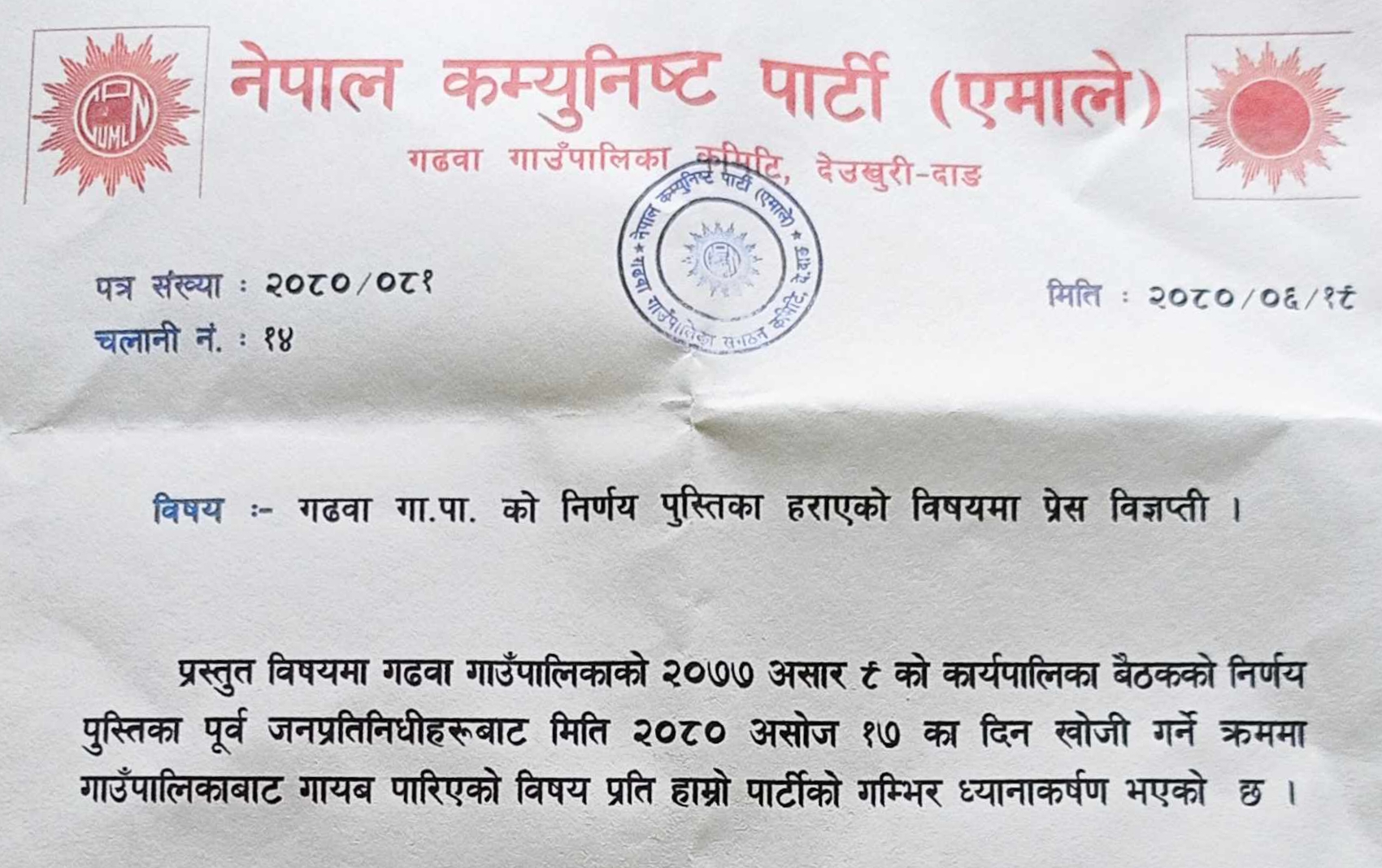 गढवा गाउँपालिकामा २०७७ अषाढ ९ गतेको कार्यपालिका बैठकको निर्णय पुस्तिका पुर्व जनप्रतिनिधिहरुबाट मिति २०८० असोज १७ का दिन खोजी गर्ने क्रममा गाउँपालिकाबाट गायब गरिएको विषय प्रती नेकपा एमाले पार्टी गढवाले गम्भीर ध्यान आकर्षण जनाएको हो ।