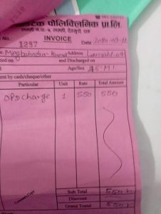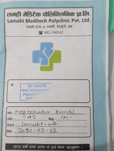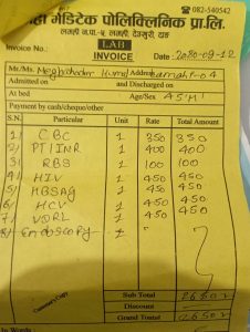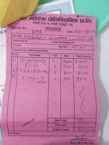 त्यहाँ ईन्डोस्कोपी चेकजाँच सँगै चिकित्सिकले आफ्नै सुरमा अन्य चेकजाँच गर्न लगाए । गाउँका सामान्य ब्यक्तिले चिकित्सकको कुरा काट्नपनि सकेनन् । चिकित्सकको सल्लाह कुमालले मान्दै गए । चिकित्सकले रगत सँगै हेपाटाईटिस ‘बि’, कोभिड-१९, एचआईभी सम्मका चेकजाँच तथा एक्सरेसम्म गर्न भ्याए । कुमालले चिकित्सिकले आफ्नो अनाबस्यक १३ किसिमका विभिन्न चेकजाँच गरिदिएको जानकारी दिए । बिल भुक्तानीका क्रममा चेकजाँच र औषधीको १२ हजार १ सय २९ रुपैया हुनपुग्यो । सामान्य मजदुरी गरि खाने कुमाल सामान्य चेकजाँचका लागि महँगोमा परे ।