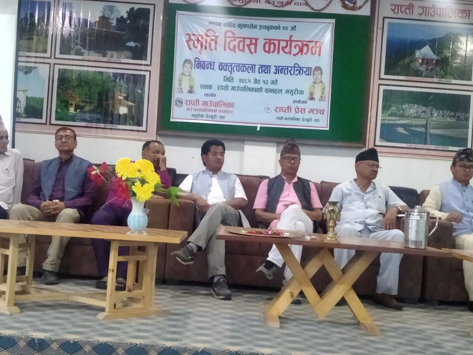 दाङ । राप्ती प्रेस मञ्च भालुबाङको आयोजना र राप्ती गाउँपालिका कार्यालय मसुरियाको सहयोगमा महान सांस्कृतिक सहित कृष्णशेन इच्छुकको २२ औं स्मृति दिवस कार्यक्रम विच आज मसुरियामा सम्पन्न भएको छ।