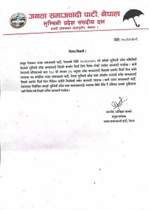 त्यस्तै सोही अनुसार संविधानको धारा १८८ को उपधारा २ अनुसार प्रदेश सरकारलाई दिइएको समर्थन फिर्ता लिन सक्ने व्यवस्था भए बमोजिम जनता समाजवादी पार्टी,नेपाल लुम्बिनी प्रदेश सभा संसदीय दललाई समेत सरकारलाई दिएको समर्थन फिर्ता लिन निर्देशन पार्टीले दिइसकेको विज्ञप्तिमा उल्लेख छ ।