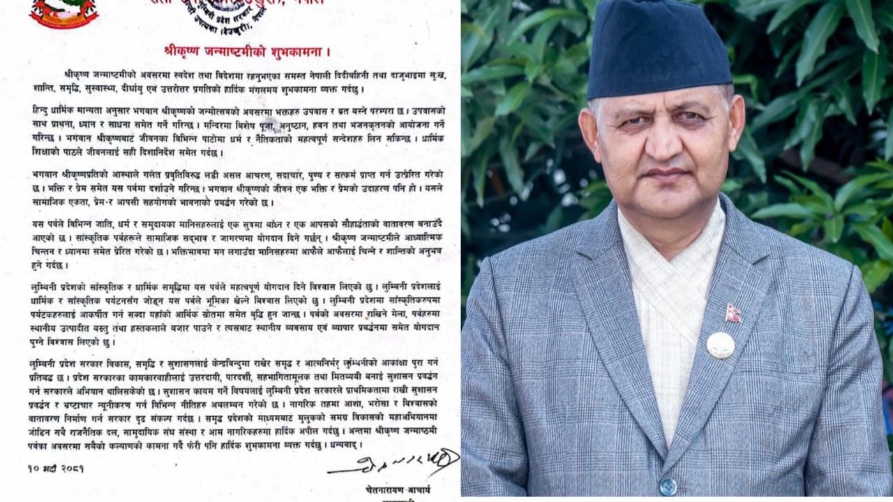 श्रीकृष्ण जन्माष्टमीको अवसरमा शुभकामना दिदै उनले प्रदेश सरकार विकास, समृद्धि र सुशासनलाई केन्द्रविन्दुमा राखेर समृद्ध र आत्मनिर्भर लुम्बिनीको आकांक्षा पुरा गर्न प्रतिबद्ध रहेको बताएका हुन । प्रदेश सरकारका कामकारवाहीलाई उत्तरदायी, पारदर्शी, सहभागितामूलक तथा मितव्ययीबनाई सुशासन प्रवद्र्धन गर्न सरकारले अभियान थालिसकेको जानकारी दिएका छन् ।