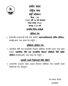 त्यस्तै राष्ट्रियसभा अध्यक्ष नारायण प्रसाद दाहालले विषयगत समितिका रिक्त सभापति पदको निर्वाचनको दिन तोक्ने कार्यसूची रहेको संसद सचिवालयले जनाएको छ ।
