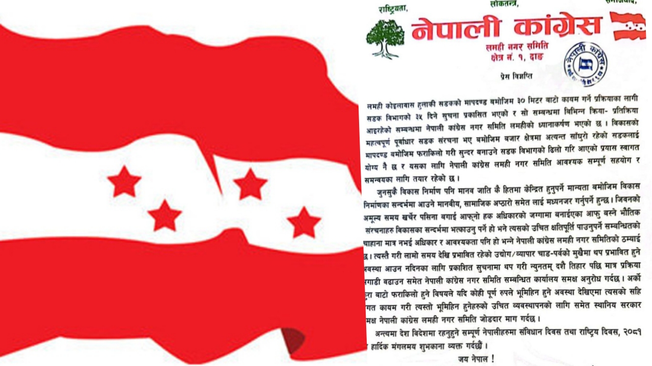 दाङ । नेपाली काङ्ग्रेस लमही नगर समितिले लमही–कोइलावास सडक विस्तार बारे आफ्नो धारणा सार्वजनिक गरेको छ ।