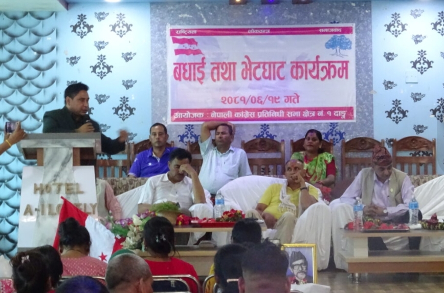 नेपाली काँग्रेस दाङ क्षेत्र नम्बर १ का सभापती भेयराज पाण्डेयको सभापतित्व तथा नेपाली काँग्रेस दाङ जिल्ला सभापती शँकर डाँगीको प्रमुख आतिथ्यमा कार्यक्रम भएको हो । काँग्रेस बाट निर्बाचित प्रदेश साँसदहरु मन्त्री भएको भन्दै बधाई तथा भेटघाट कार्यक्रमको आयोजना गरिएको क्षेत्रिय प्रबक्ता अजय न्यौपानेले जानकारी दिए । कार्यक्रममा महाधिबेसन प्रतिनिधि मधु न्यौपाने, महासमिती सदस्यहरु मोहन गिरी, कर्णबहादुर बुढाथोकी लगायतले आ-आफ्नो धारणा राखेका थिए । कार्यक्रमको सहजिकरण क्षेत्रिय सहसचिब प्रकाश जिसीले गरेका थिए ।