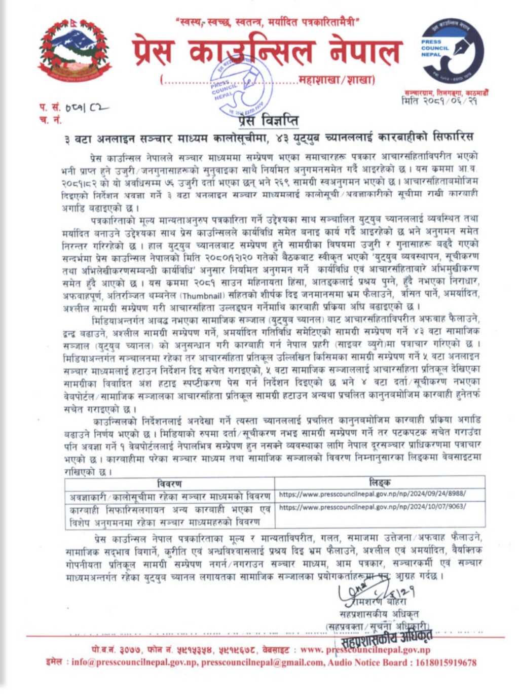 “मिडियाअन्तर्गत आबद्ध नभएका सामाजिक सञ्जाल (युट्युब च्यानल )बाट आचारसंहिताविपरीत अफवाह फैलाउने, द्वन्द्व बढाउने, अश्लील सामग्री सम्प्रेषण गर्ने, अमर्यादित गतिविधि समेटिएको सामग्री सम्प्रेषण गर्ने ४३ वटा सामाजिक सञ्जाल (युट्युब च्यानल)को अनुसन्धान गरी कारबाही गर्न नेपाल प्रहरी (साइबर ब्युरो)मा पत्राचार गरिएको छ,” विज्ञप्तिमा भनिएको छ ।