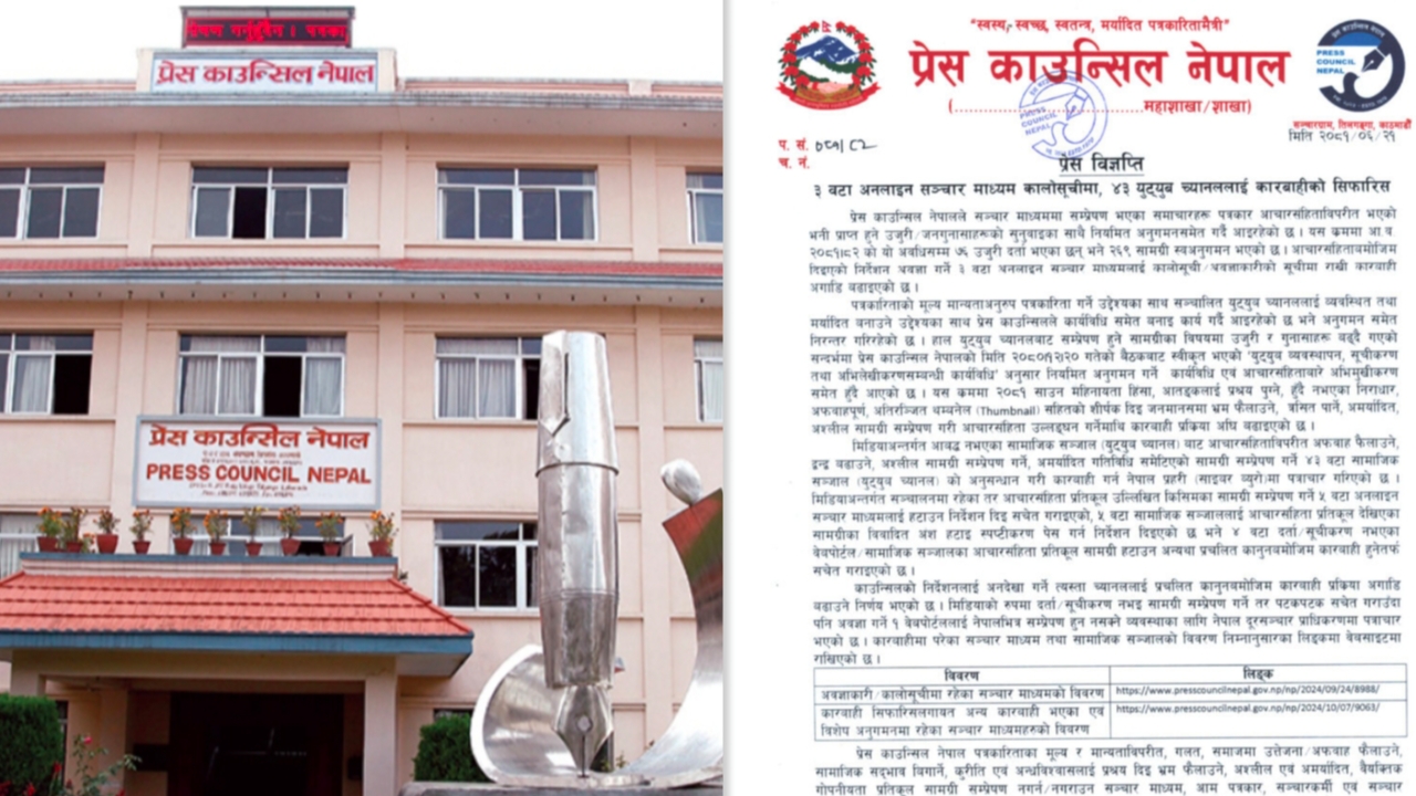 काठमाडौं । प्रेस काउन्सिल नेपालले तीन अनलाइन सञ्चारमाध्यमलाई कालोसूचीमा राख्दै ४३ युट्युब च्यानललाई कारबाहीको सिफारिस गरेको छ ।