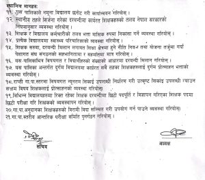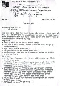 त्यस्तै ज्ञापनपत्रमा स्थानीय तहले सिर्जना गरेका दरबन्दीमा कार्यरत शिक्षकहरुको तलब नेपाल सरकारको नियमानुसार व्यवस्था गर्नुपर्ने,दुर्गम विद्यालयमा कार्यरत सबै तहका शिक्षकहरुलाई दुर्गम प्रोत्साहन भत्ताको व्यवस्था गर्नुपर्ने, गाउँपालिका अनुदानका शिक्षकहरुको बिरामी विदा सञ्चित गरी उपयोग गर्न पाउने व्यवस्था गर्नुपर्ने,पालिका स्तरीय आन्तरिक परीक्षा समिति पुनर्गठन गर्नुपर्ने लगायतका राष्ट्रिय,स्थानीय र पेशागत २१ बुदे माग समेटिएको छ।