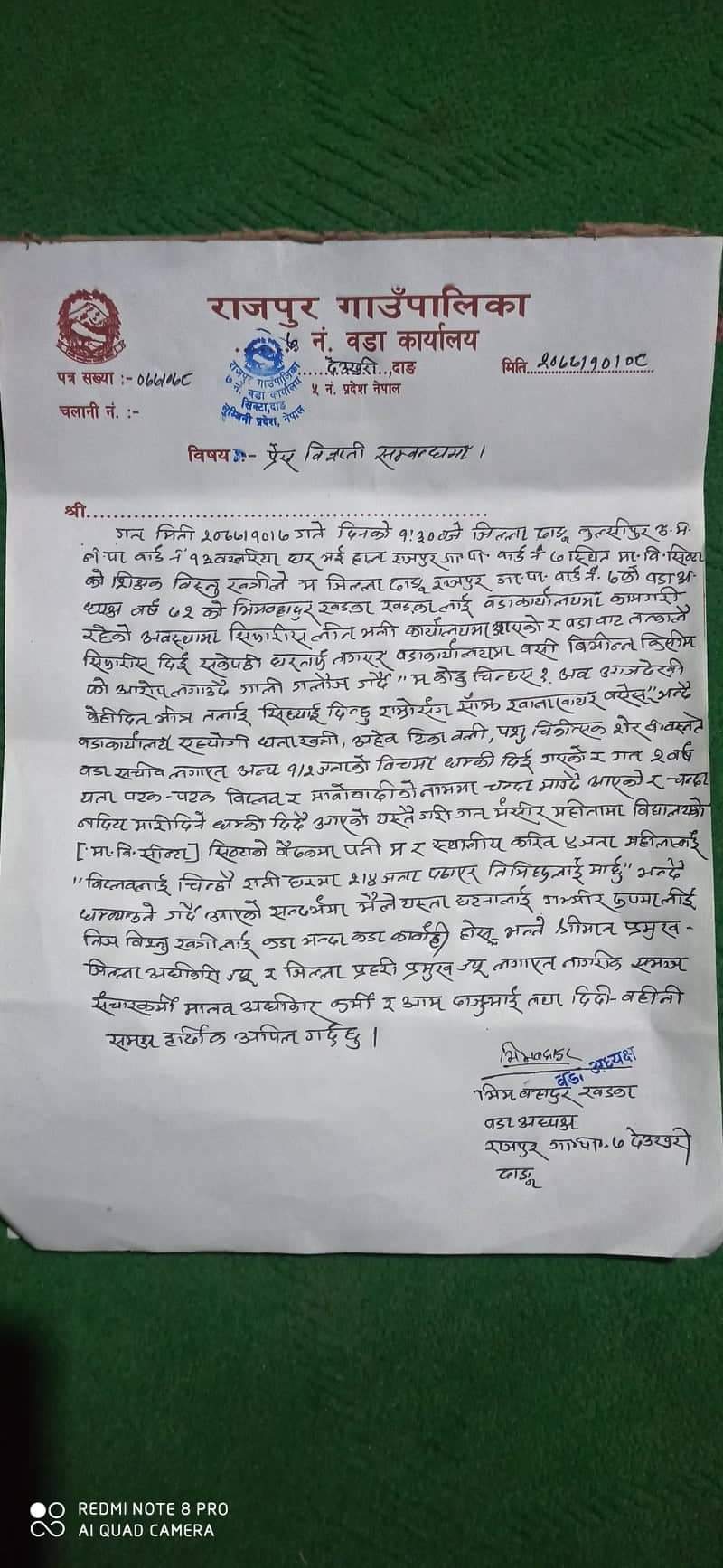 वडा अध्यक्ष खड्काले आफुलाई धम्की दिने शिक्षकलाई कानुनी कारबाहीको दायरामा ल्याउन प्रमुख जिल्ला अधिकारी,प्रहरी प्रमुख, नागरिक समाज,मानव अधिकारकर्मी संग अनुरोध गर्नु भएको छ ।