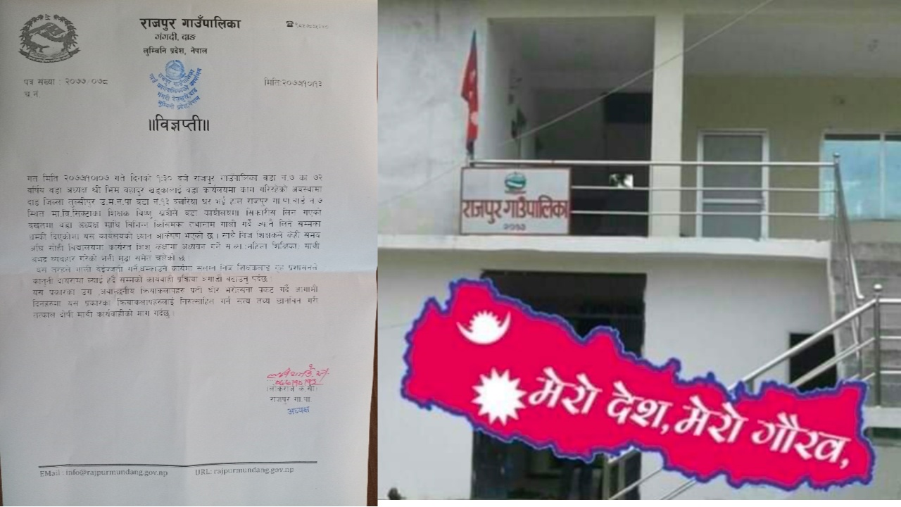 गत ७ गतेका दिन दिउँसो १:३० बजे वडा कार्यालयमा काम गरिरहेको अबस्थामा दाङ जिल्ला तुलसीपुर उपमहानगरपालिका वडा नम्बर १३ वखरिया घर भई हाल माध्यमिक विद्यालय सिक्टामा प्रअको रुपमा कार्यरत रहेका खत्रीले वडा कार्यालयमा सिफारिस लिन गएको बखतमा वडा अध्यक्ष खड्का माथि विभिन्न किसिमका तथानाम गाली गर्दै ज्यानै लिने सम्मको धम्की दिएकोमा गाउँपालिकाको गम्भीर ध्यानाकर्षण भएको राजपुर गाउँपालिकाका अध्यक्ष लोकराज केसीले मंगलबार एक विज्ञप्ति मार्फत जानकारी दिनु भएको हो ।