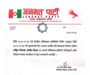 काठमाडौँ । जनमत पार्टीले यहीँ पुस १७ गते धोती दिवस मनाउने निर्णय गरेको छ ।