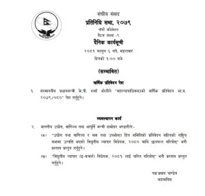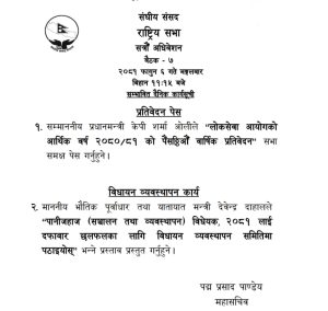 त्यस्तै विद्युतीय व्यापार (इ–कमर्स) विधेयक, २०८१ पारित गर्न मन्त्री मन्त्री भण्डारीले प्रस्ताव गर्ने संसद् सचिवालयले जनाएको छ । राष्ट्रियसभाको बैठकमा प्रधानमन्त्री ओलीले लोकसेवा आयोगको आर्थिक वर्ष २०८०-८१ को ६५ औँ वार्षिक प्रतिवेदन पेस गर्ने कार्यसूची छ ।