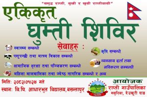 दाङ । देउखुरीको राप्ती गाउँपालिकाले बैशाख २४ गते अर्थात भोलि बुधबार वडा नम्बर ३ स्थित बसन्तापुरमा एकदिने एकीकृत घुम्ती सेवा शिविर सञ्चालन गर्ने भएको छ ।