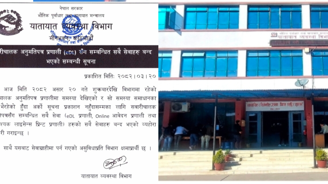 ‘सवारी चालक अनुमतिपत्रसँग सम्बन्धित सबै सेवा (ईडीएल प्रणाली, अनलाइन आवेदन प्रणाली तथा अत्यावश्यक लाइसेन्स प्रणाली)हरूको सबै सेवाहरू बन्द भएको व्यहोरा जानकारी गराइन्छ ।’ विज्ञप्तिमा भनिएको छ ।