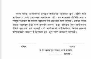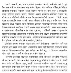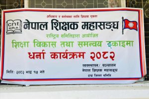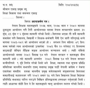 प्रतिनिधि सभा अन्तर्गतकाे शिक्षा स्वास्थ तथा सूचना प्रविधि समितिले विद्यालय शिक्षा विधेयककाे प्रतिबेदन पास गरेर भाद्र ५ गते प्रतिनिधिसभामा पेस गरेपछि विगतमा सरकार र नेपाल शिक्षक महासंघ बिच पटकपटक भएका सम्झाैहरु विद्यालय शिक्षा विधेयकमा नसमेटिएकाे भन्दै दवाब दिन ७७ वटै जिल्लामा अबस्थित शिक्षा विकास तथा समन्वय ईकाइमा धर्ना तथा ध्यानाकर्षण पत्र बुझाएकाे छ । जिल्लामा क्रियाशील विभिन्न ७ वटै महासंघ आबद्ध संस्थाका केन्द्र,प्रदेश र स्थानीय तहका शिक्षकहरु प्रतिनिधीमुलक रुपाम उपस्थित रहेकाे थियोे ।