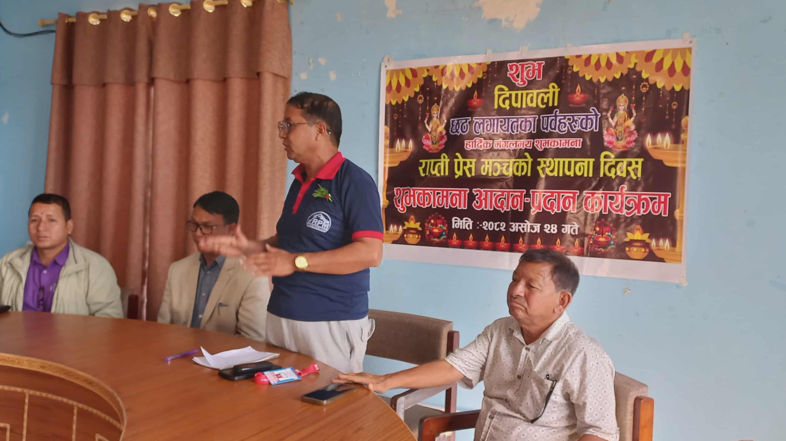 राप्ती प्रेस मञ्चले तिहार, छठ लगायतका पर्वको अवसर पारेर शुक्रबार दाङको राप्ती गाउँपालिकामा आयोजना गरेको शुभकामना आदानप्रदान तथा मञ्चको स्थापना दिवस कार्यक्रममा बोल्दै अध्यक्ष विष्टले सो कुरा बताएका हुन् । प्रमुख अतिथि समेत रहेका अध्यक्ष विष्टले पत्रकारहरुमा खोज पत्रकारिता हुनुपर्नेमा सत्यतथ्य नबुझेर कसैले फेसबुकमा लेखेका स्टाटसलाई समाचार बनाएर पोष्ट गर्दा समाजमा मानसिक समस्या बढ्दै गएको बताए ।
