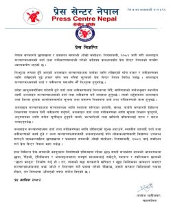 आज एक विज्ञप्ति जारी गर्दै प्रेस सेन्टरले सरकारको यो कदमको विरोध गरेको हो । ‘नेपाल सरकारले छापाखाना र प्रकाशन सम्बन्धी (दोस्रो संशोधन) नियमावली,२०८२ जारी गरी अनलाइन सञ्चारमाध्यमको दर्ता तथा नवीकरण सम्बन्धी गरेको कतिपय प्रावधानप्रति प्रेस सेन्टर नेपालको गम्भीर ध्यानाकर्षण भएको छ ।