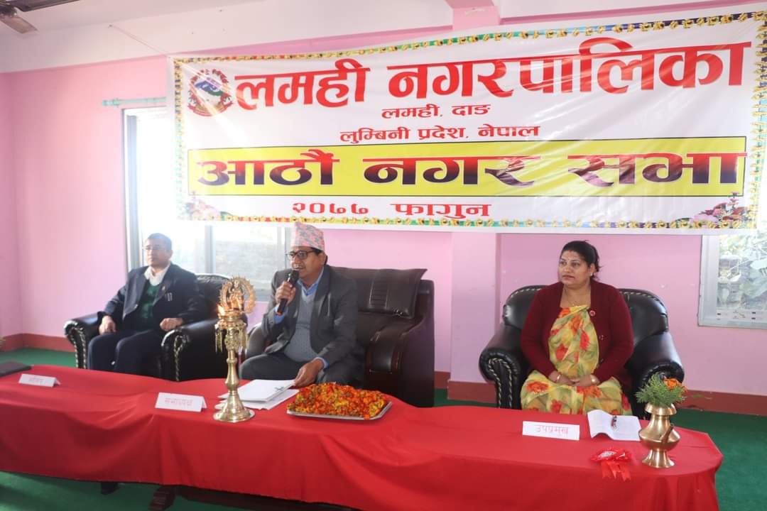 दाङ । लमही नगरपालिकाको आठौँ नगर सभा लमहीमा सम्पन्न भएको छ । नगरपालिकाको चालु आर्थिक वर्ष २०७७÷०७८ मा वार्षिक बजेट ८८ करोड ७१ लख ४२ हजार ३ सय ६० रुपैयाँ मध्ये १५ करोट ३३ लाख ३ हजार ९ सय ३१ रुपैयाँ ३२ पैसा खर्च भएको छ । यो खर्चको कुल १७ दशमलव २८ प्रतिशत हो ।