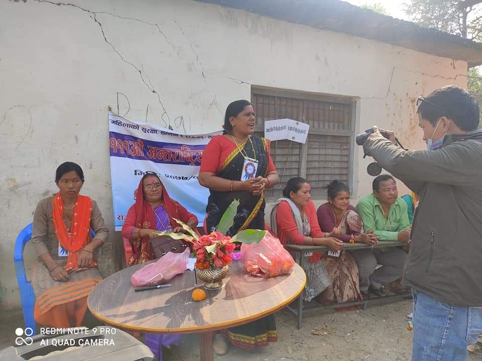 कार्यक्रममा बोल्ने बक्ताहरुले नारीहरु आफ्नो हक र अधिकारका प्राप्तिका निम्ति सधै आवाज उठाउन पछि पर्न नहुने र नारिहरुको प्रगतिको निम्ति शुभकामना दिईएको थियो । कार्यक्रममा विभिन्न प्रकारका खेलकुदको आयोजना गरिएको थियो भमे सो कार्यक्रमको संचालन खिमा बुढाले गर्नु भएको थियो ।