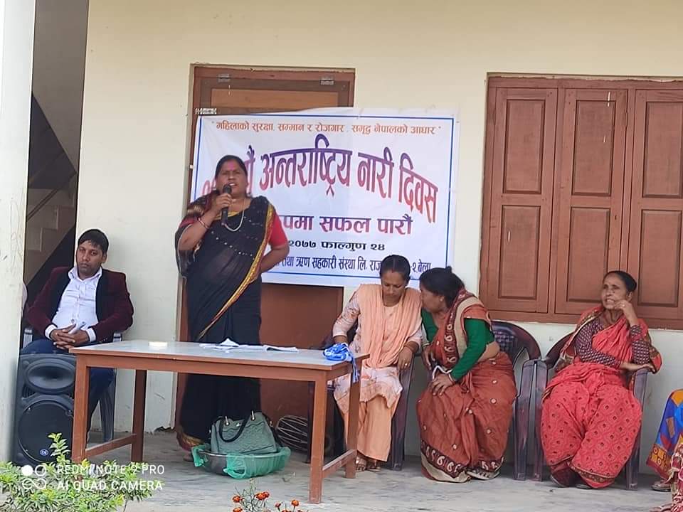 राजपुरको १ कठबेरुवाको बाल जनता प्रावीको प्राङ्गणमा उक्त वडामा रहेको सित्तल छाँया समुह समितीको आयोजनामा नारी दिवश मनाईएको हो । समितिका अध्यक्ष भेगि डाङ्गीको अध्यक्षता,राजपुर गा.पाका उपाध्यक्ष धनपतिदेवी यादवको प्रमुख आतिथ्य,राजपुर १ का वर्डा सदस्य गोमा अधिकारीको विशेष आतिथ्यमा सम्पन्न भएको कार्यक्रममा बालजनता प्राविका विव्यस अध्यक्ष नारायण पुन,नेपाली काङ्रेस राजपुर १ कापार्टी सभापति रामबकश चौधरी,नेकपा एमाले जिल्ला सदस्य यामलाल वलि,राष्ट्रिय जनमोर्चा पार्टी प्रतिनिधि बेमराज खनाल,समाजसेवी पतिराम यादब महिला स्वयंसेविका रेबा बुढा,जेष्ठ नागरिक कुमारी वलि,मिडियाको तर्फबाट टोपेन्द्र खनाल लगायतकाले शुभकामना मन्तव्य व्यक्त गर्नु भएको थियो ।