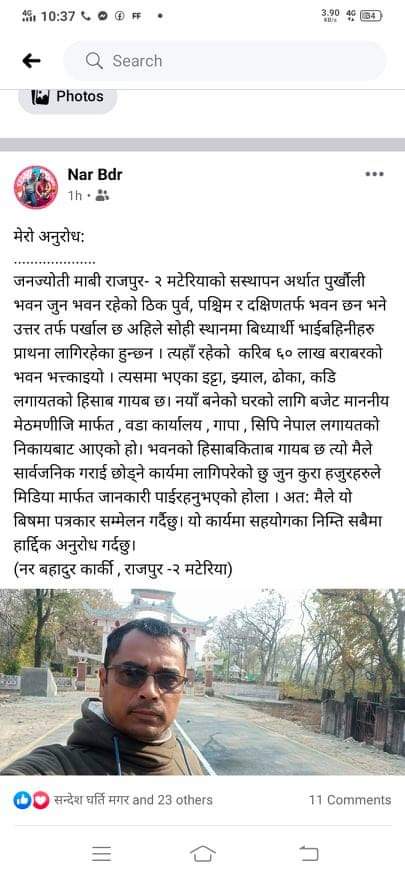 दाङ । देउखुरी राजपुर गापा वडा नम्बर २ मा रहेको जनज्योति माविको पुर्खौली भवनको हिसाब किताब आम नागरिकको बिचमा सार्वजनिक गर्नुपर्ने लगायतको विषयमा छिट्टै स्कुल प्राङ्गणमा राजपुर २ निवासी नरबहादुर कार्कीले पत्रकार सम्मेलनको आयोजना गरिने ब्यहोरा सिधापत्र अनलाईनलाई बताएका छन।