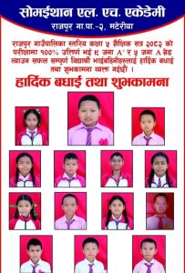 दाङ । राजपुर गाउँपालिका गाउँपालिका वडा नम्बर २ मटेरियास्थित सोमईथान एल.एच एकेडेमीले शैक्षिक सत्र २०८२ को वार्षिक परीक्षामा कक्षा ५ तर्फ उल्लेखनीय सफलता हासिल गरेको छ । विद्यालयका अनुसार परीक्षामा सहभागी सबै विद्यार्थी उत्तीर्ण हुँदै १०० प्रतिशत नतिजा ल्याउन सफल भएका हो ।