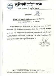 त्यस्तै,सूचना अनुसार अधिवेशन वैशाख १७ गते बिहीबार दिउँसो १ बजे बस्ने तय गरिएको छ । लुम्बिनी प्रदेश सभा नियमावली, २०७९ को नियम ३ को उपनियम ९१० बमोजिम प्रदेश सभा सदस्यहरुलाई जानकारी गराउने उद्देश्यले सूचना प्रकाशन गरिएको प्रदेश सभा सचिव दुर्लभ कुमार पुन मगरले जानकारी दिए ।