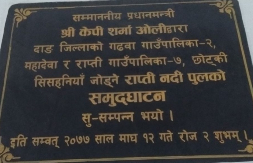 दाङ । नेपालकाे दाेस्राे लामाे पक्की पुलमा नयाँ शिलालेख मंगलबार राखिएकाे छ । प्रधानमन्त्री केपी शर्मा ओलीले माघ १२ गते पक्की पुलकाे उद्घाटनका क्रममा अनावरण गरेकाे शिलालेख केही दिनमै ताेडफाेड भएको थियाे ।
