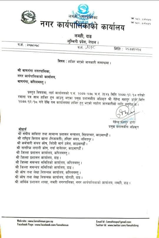 बाणगँगा नगरपालिका कपिलबस्तु बाट यही चैत्र १७ गते रमाना लिएर आएका बिबादित कार्यकारी डाँगीलाई लुकिछिपि १८ गते नै लमही नगरपालिकामा हाजिर गराएको रहस्य बाहिर आएको छ । जुन हाजिर भएको जानकारी पत्रमा डाँगीको आफ्नै हस्ताक्षर छ ।