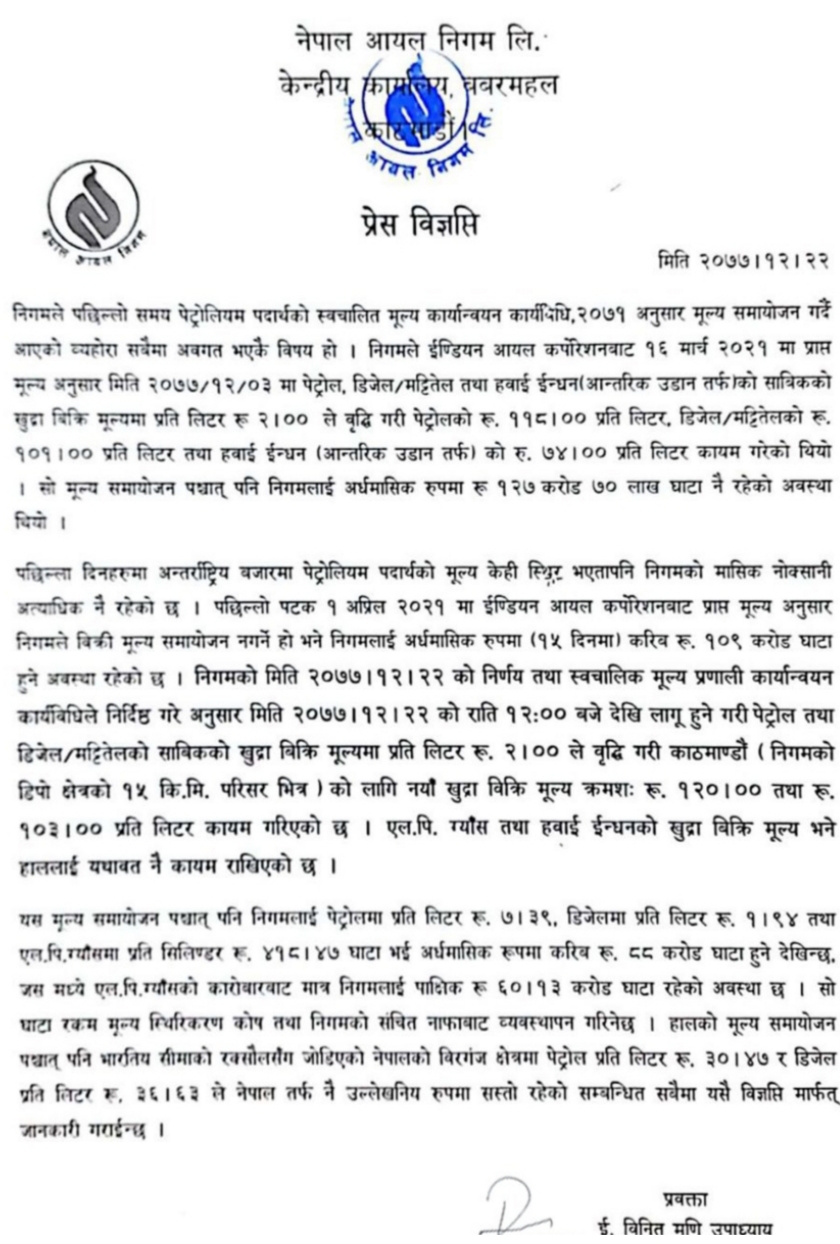 खाना पकाउने एलपी ग्यास र हवाई इन्धनको खुद्रा बिक्री मूल्य भने हाललाई यथावत् नै राखिएको छ ।