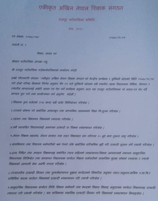 दाङ । एकीकृत अखिल नेपाल शिक्षक संगठनद्वारा राजपुर गाउँपालिकामा विभिन्न ९ बुदे मागसहितको ज्ञापनपत्र बुधबार पेश भएको छ ।