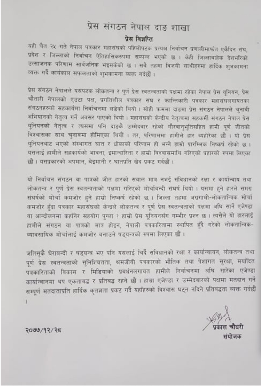 दाङ । दाङको पत्रकार महासंघको चुनाबमा गठबन्धन गरेको प्रेस युनियन दाङले अन्तर्घात र धोका दिएको प्रेस सेन्टरले निष्कर्ष निकालेको छ ।सेन्टरका जिल्ला अध्यक्ष प्रकाश चौधरिले शनिबार प्रेस बिज्ञप्ति जारी गरेर युनियनले चुनाबमा धोका दिएको निष्कर्ष निकालीएको बताएका हुन ।