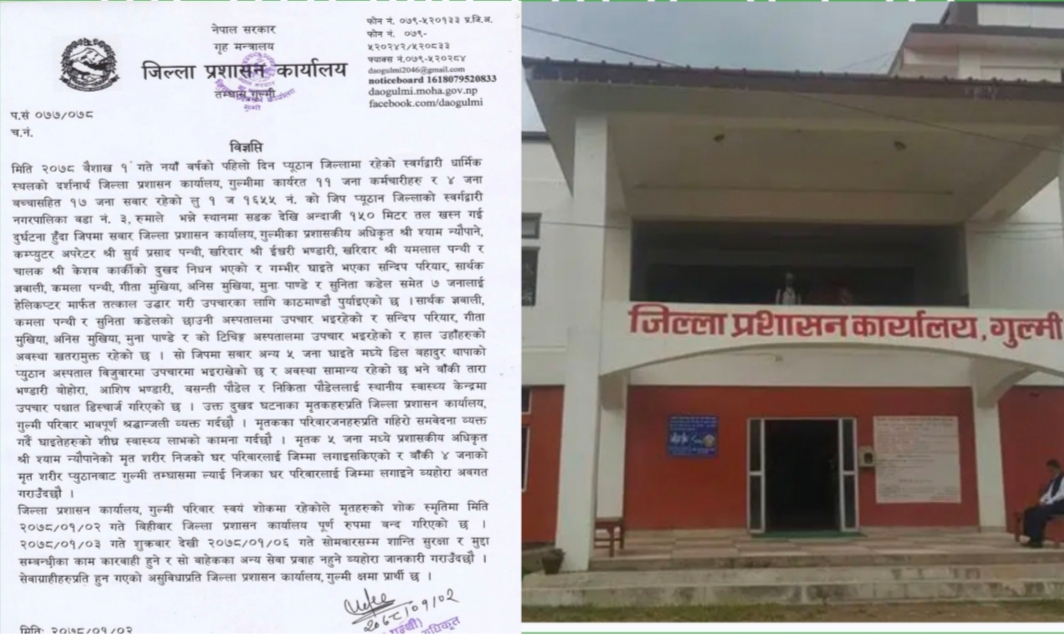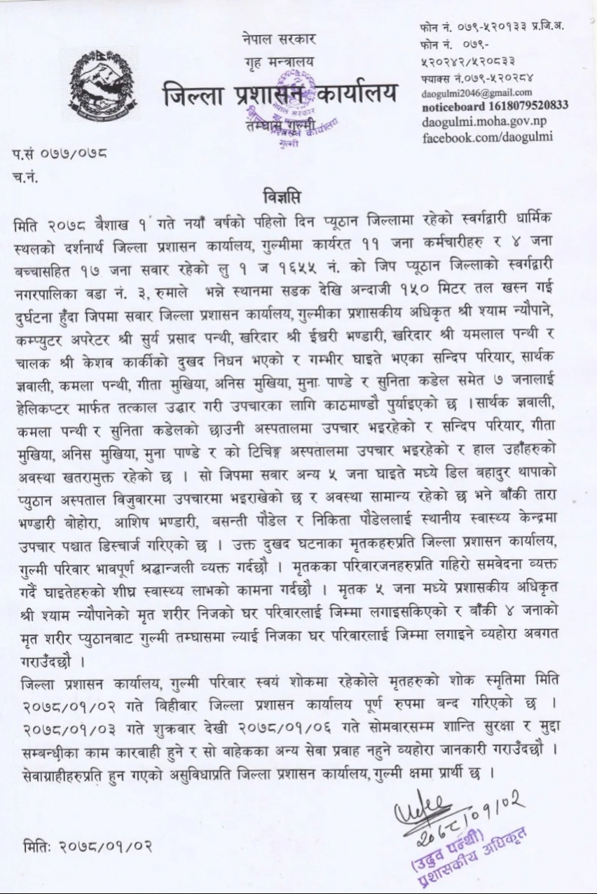 बैशाख १ गते गुल्मीबाट नयाँ वर्ष मनाउन जिल्ला प्रशासन कार्यालय गुल्मीका कर्मचारी सहितको टोली धार्मिक तीर्थस्थल प्युठानको स्वर्गद्वारी जाने क्रममा प्यूठानको स्वर्गद्वारी नगरपालिका–३ रुमालेमा दुर्घटनामा मृत्यु भएकाहरुको शोकमा कार्यालयका अत्याबश्यक बाहेक सबै सेवा बन्द गर्ने निर्णय गरिएको जिल्ला प्रशासन कार्यालय गुल्मीका प्रशासकीय अधिकृत उद्धव पन्थीले बताउनु भयो ।