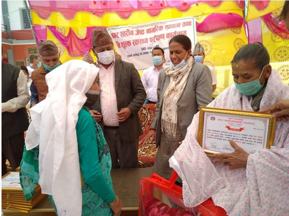 त्यस्तै आज बयाेबृद्व एबम अनाथ संरक्षण मञ्च भबनकाे प्राङ्गण बिजुवारमा आयोजित कार्यक्रममा उनिहरुलाई सम्मान स्वरुप दाेसल्ला,सम्मान पत्र र अबिरले सम्मान गर्नुका साथै सहारा स्वरुप लठ्ठि, थम्रस ,लाईट,र बलाङ्केट हस्तान्तरण गरिएकाे छ। साथै जेष्ठ नागरिकहरुलाई निशुल्क स्वास्थ्य परिक्षण तथा निशुल्क औषधि बितरण गरिएकाे छ। प्युठान नगरक्षेत्र भित्रका दशवटा वडाबाट १०/१० जनाका दरले जेष्ठनागरिक छनाैट गरि एकसाथ सबैलाई सम्मान गरिएको प्युठान नगरपालिका प्रमुख अर्जुन कुमार कक्षपतिले बताउनुभयो। कार्यक्रममा बोल्दै कक्षपतिले नगर सरकार सधै जेष्ठनागरिकको साथमा रहेको बताउनुभयो।
