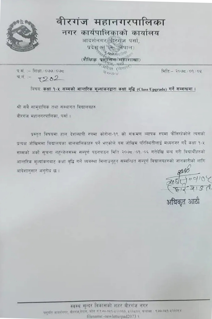 वीरगन्ज । वीरगन्ज महानगरपालिकाले महानगर अन्तरगतका कक्षा १ देखि ५ सम्मका सम्पूर्ण निजी तथा सामुदायीक विद्यालयहरु अर्काे सुचना नआउन्जेलसम्मका लागि बन्द गर्न सुचना जारी गर्दै निर्देशन दिएको छ ।
