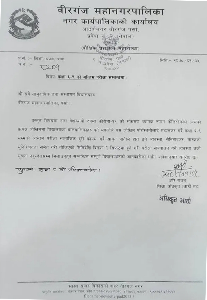 त्यसैगरी महानगरको शिक्षा प्रशासन महाशाखाले कक्षा ६, ७ र ९ को हकमा अर्काे विज्ञप्ति निकालेको छ । विज्ञप्तिमा कक्षा ६ देखि ९ सम्मको अन्तिम परिक्षा तोकिएकै समयमा हुने भनेर उल्लेख गरिएको छ । सामाजिक दुरी कायम गर्ने, साबुन–पानीले हात धुने र मास्क तथा सेनिटाईजरको सुनिश्चितता गरी परिक्षा तोकिएको मितिदेखि, दिनको दुई सिफ्ट गरि परिक्षा सञ्चालन गर्न सबै विद्यालयहरुलाई अनुरोध समेत गरेको छ ।