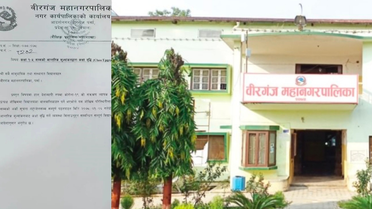 वीरगन्ज महानगरपालिकाको शैक्षिक प्रशासन महाशाखाले आईतबार एक विज्ञप्ति जारी गर्दै कक्षा १ देखि ५ सम्मका सबै विद्यालयको पठनपाठन बन्द गर्ने निर्णय गरेको हो । कोभिड–१९ महामारी फैलिरहेकोले विद्यार्थीहरुको स्वास्थ्यलाई मध्यनजर गर्दै यो निर्णय गरिएको महानगरपालिकाका शैक्षिक प्रशासन महाशाखाका शिक्षा अधिकृत हरि राउतले जानकारी दिनु भयो । त्यस्तै उहाँले वीरगन्ज भित्रका विद्यालयहरुलाई कक्षा १ देखि ५ सम्मका विधार्थीहरुको आन्तरिक मुल्यांकन कक्षा वृद्धि गर्ने व्यवस्था मिलाउन समेत अनुरोध गरेको बताउनु भयो ।