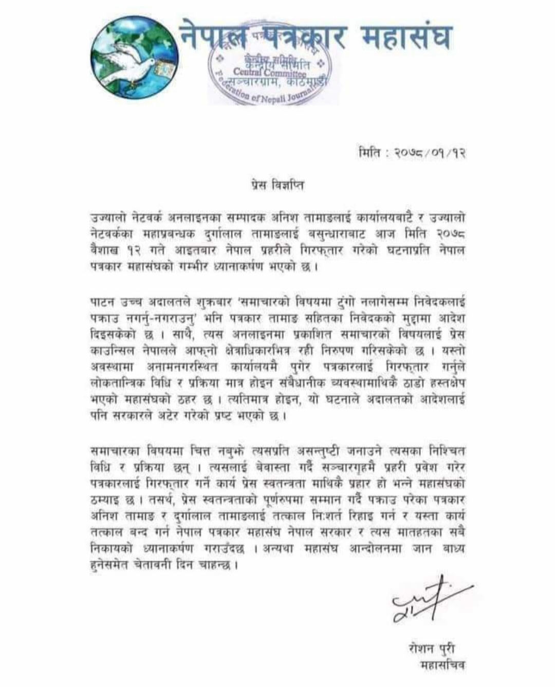 नेपाल पत्रकार महासंघका महासचिव राेशन पुरीद्वारा हस्ताक्षर विज्ञप्तिमा भनिएकाे छ। `उज्यालो नेटवर्क अनलाइनका सम्पादक अनिश तामाङलाई कार्यालयबाटै र उज्यालो नेटवर्कका महाप्रबन्धक दुर्गालाल तामाङलाई बसुन्धाराबाट आज मिति २०७८ वैशाख १२ गते आइतबार नेपाल प्रहरीले गिरफ्तार गरेको घटनाप्रति नेपाल पत्रकार महासंघको गम्भीर ध्यानाकर्षण भएको छ ।