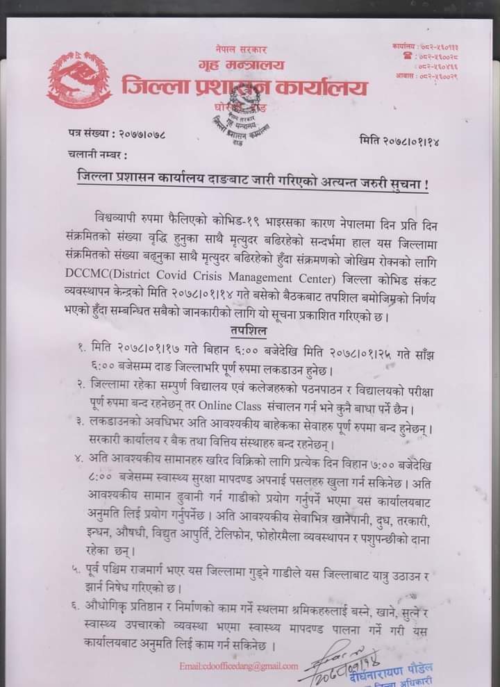 दाङ । जिल्ला भरि यही वैशाख १७ गते देखि २५ गते सम्म ९ दिनको लागि पूर्णरुपमा लक्डाउन हुने भएको छ ।
