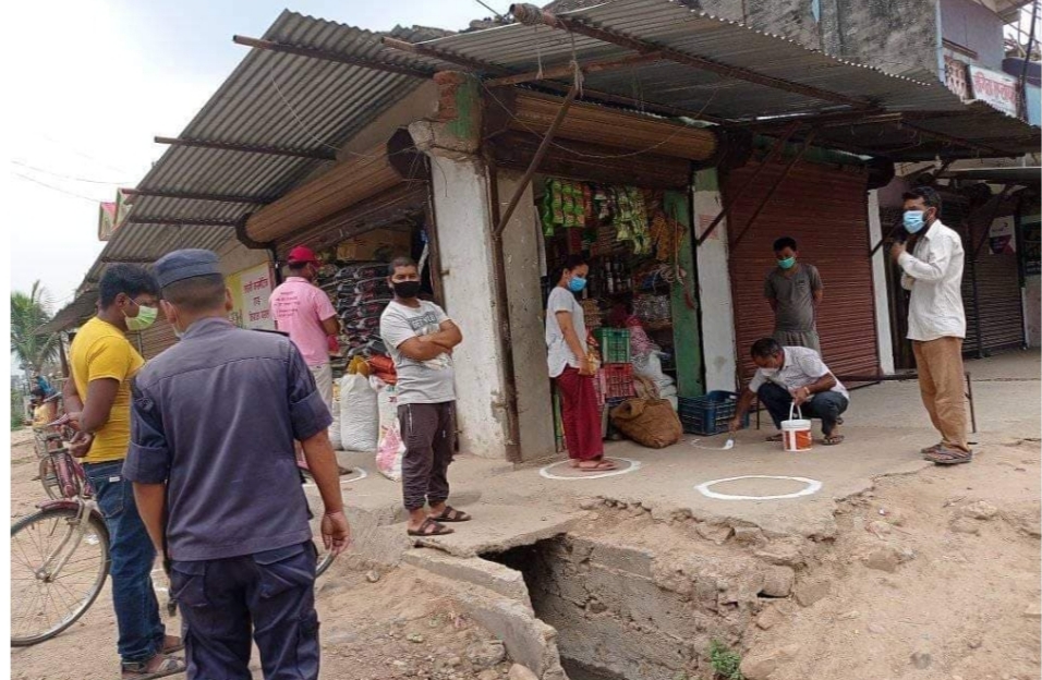 त्यसैगरी खाद्याान्न, किराना, फलफूल तरकारी, मेडीकल, एग्रोभेट र दुधडेरी लगायतका पसलहरुमा गोलो घेरा लगाई सामाजिक दुरीका लागि आग्रह गरिएको र मास्क तथा सेनीटाइजरको प्रयोग गरि स्वास्थ्य सुरक्षा मापदण्ड अपनाउन प्रहरी र संघले सबैमा आग्रह गरेको संघका अध्यक्ष खिमबहादुर बुढा मगरले बताए ।