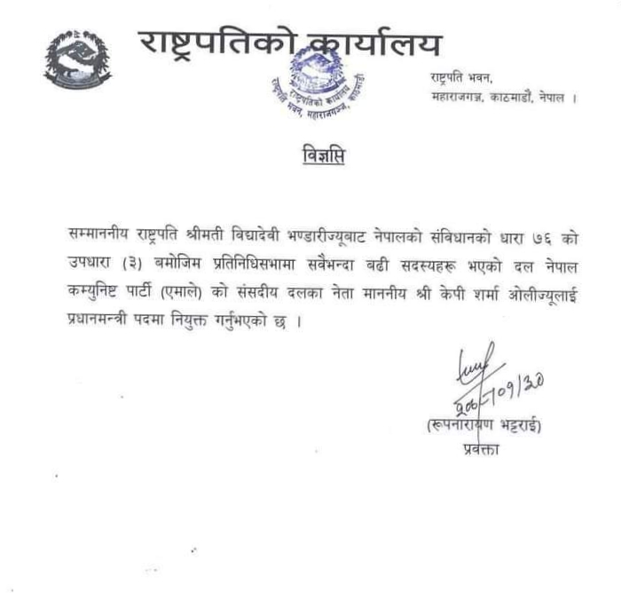 काठमाडौं । नेकपा एमाले संसदीय दलका नेता केपी शर्मा ओली प्रधानमन्त्री नियुक्त भएका छन् । राष्ट्रपति विद्यादेवी भण्डारीले संविधानको धारा ७६(३) अनुसार संसदको सबभन्दा ठूलो दलको संसदीय दलको नेता ओलीलाई प्रधानमन्त्रीमा नियुक्त गरेकी हुन् ।