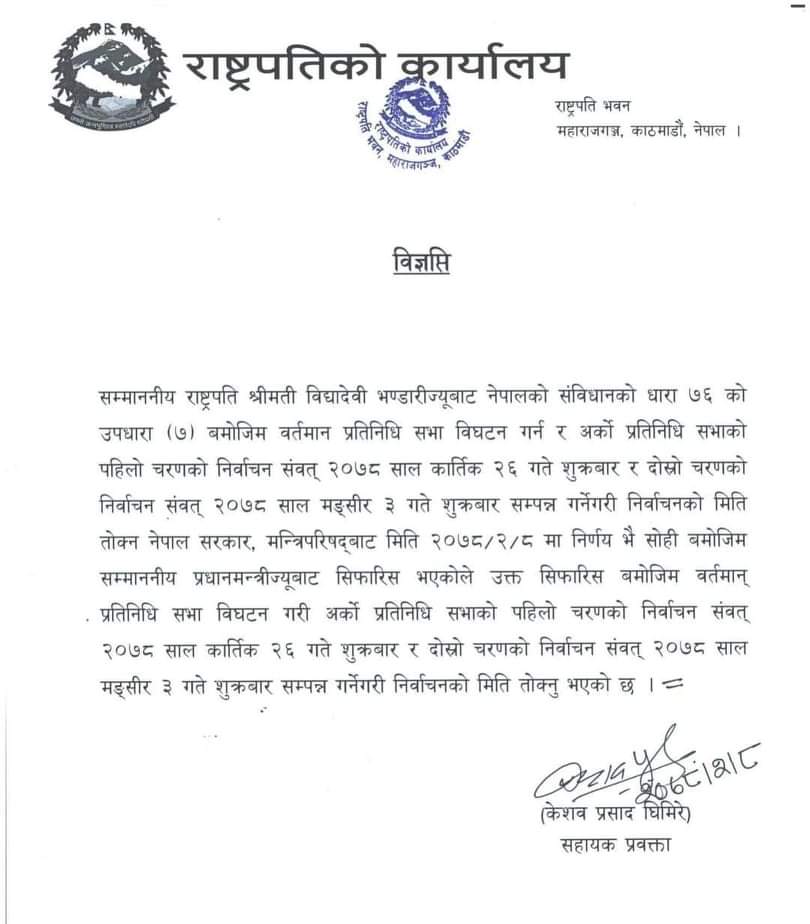 काठमाडौं । मन्त्रिपरिषद्को सिफारिशमा राष्ट्रपति विद्यादेवी भण्डारीले एकाएक मध्यरातमा प्रतिनिधिसभा विघटन गरेर मध्यावधि चुनाव घोषणा गरेकी छन् । प्रतिनिधिसभा सदस्यका लागि चुनाव कात्तिक २६ र मंसिर ३ गते गरी दुई चरणमा हुनेछ ।