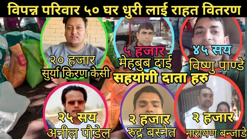 राप्ती अनलाईन न्युज परिवारका बरिस्ठ सम्पादक महेश चन्द्र रिजाल,सम्पादक जमिर शाह,मार्केटिङ्ग विष्णु पाण्डे,प्रधान सम्पादक : भिसुन शाही,जीवन केसि,श्याम झाक्री मगर,सुर्या किरण केसीले ११ बोरा चामल, सावायबिन ३ बोरा गरि २० हजार बराबरको सहयोग गरेको छ ।