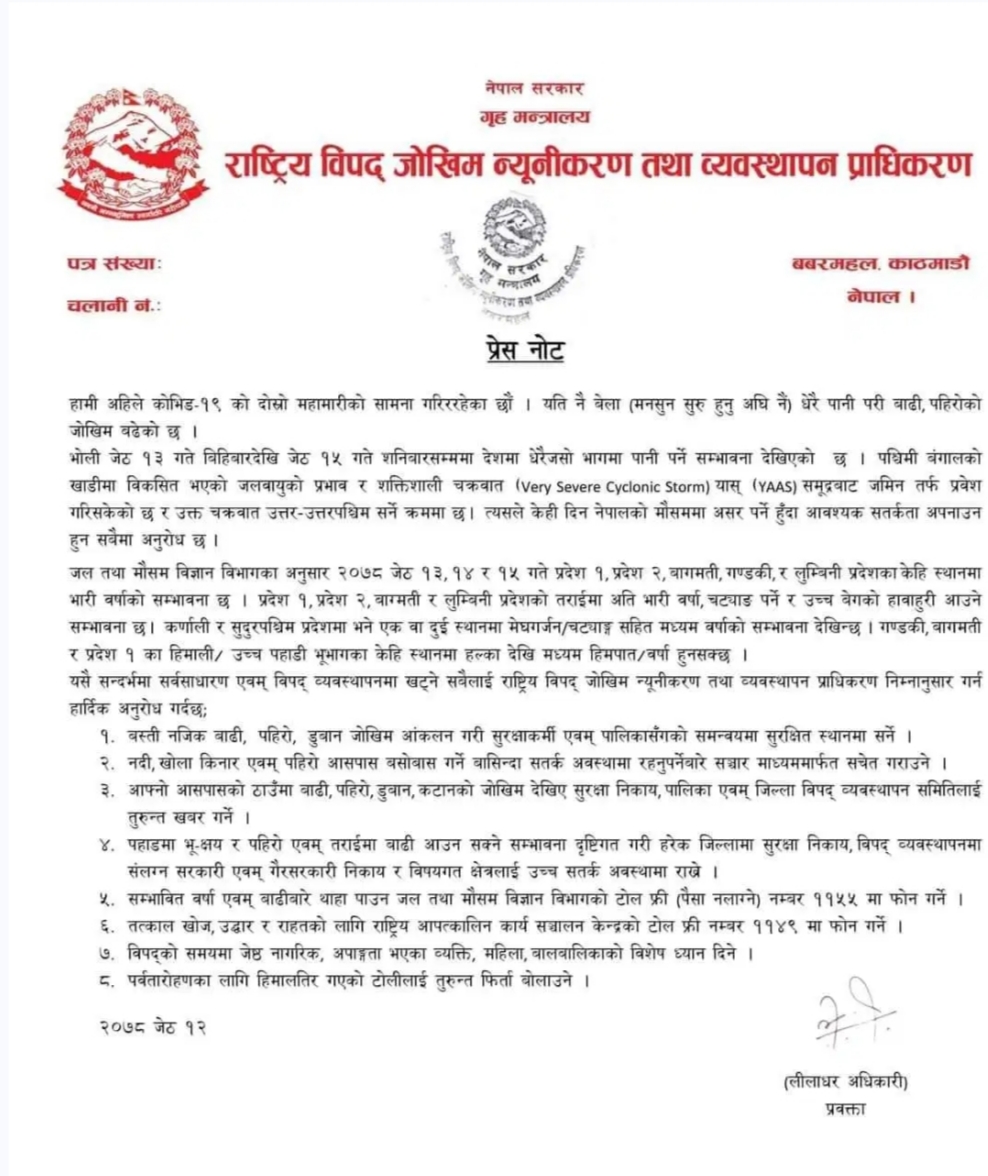 प्राधिकरणले बुधबार प्रेस नोट जारी गर्दै विपद् व्यवस्थापनमा खट्ने सबैले बाढी पहिरोको जोखिम रहेको तटीय क्षेत्र एवं सम्भावित जोखिम क्षेत्रको बस्तीलाई सुरक्षित स्थानमा सार्न आग्रह गरेको हो ।
