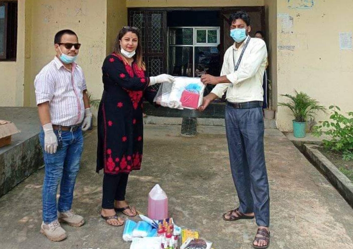 आइतवार बिमला शर्मा बोहरा र निजका पति देउखुरी उद्योग बाणिज संघका सदस्य लुमाकान्त बोहराले गढवा गाउँपालिकाले तयार गरेको कोभिड अस्थायी अस्पतालमा पुगेर इन्चार्ज सुर्य नारायण यादवलाइ १० हजार ५ सय ५५ रुपैया बराबरको पिपिइ सेट,मास्क,हेण्ड बाँस,ग्लोब्स र सेनेटाइजर प्रदान गर्नु भएको हो ।