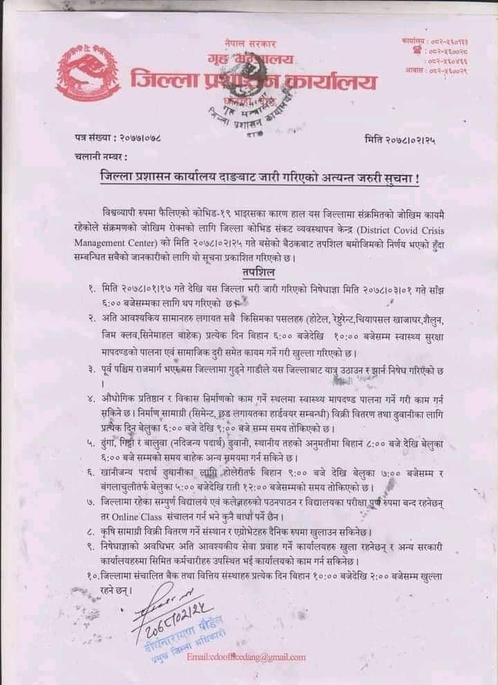 अब भने सीमित कर्मचारीको सहभागिमा सबै सरकारी कार्यालय खुल्ने दाङका प्रमुख जिल्ला अधिकारी पौडेलले बताए । उनका अनुसार मंगलबार बसेको जिल्ला कोरोना संकट व्यबस्थापन केन्द्रको बैठकले यस्तो निर्णय गरेको हो । यस अघि जेठ २५ सम्म तोकिएको निशेधाज्ञा पनि थपिएको छ । असार १ गते साँझ ६ बजेसम्मकालागि निशेधाज्ञा थपिएको उनले बताए । तर, अब भने केही खुकुलो भएको छ ।