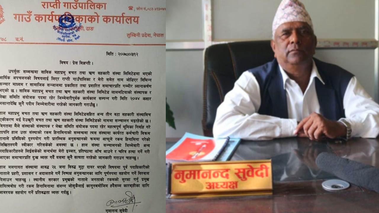 दाङ । देउखुरीको राप्ती गाउँपालिकाका अध्यक्ष नुमानन्द सुवेदीले महाप्रभु बचत तथा ऋण सहकारी संस्था लिमिटेडमा भएको आर्थिक अपचलनको विषयलाई लिएर गाउँपालिका र आफ्नो समेत नाम जोडिएकोमा एक प्रेस विज्ञप्ती मार्फत तपसिलको ध्यानाकर्षण जनाउनु भएको छ । तपसिल